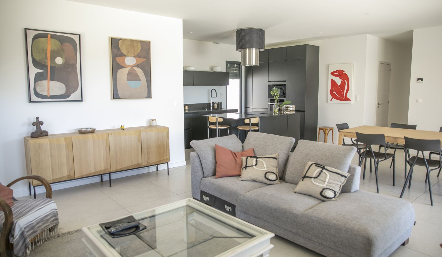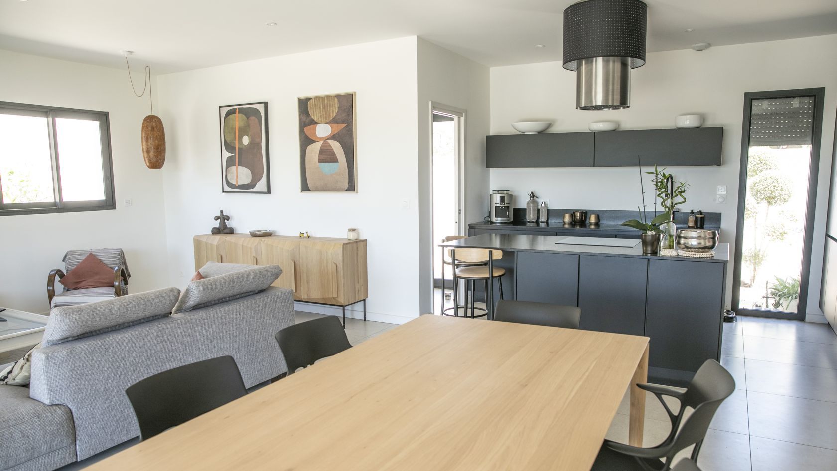 - Grande pièce à vivre lumineuse avec cuisine ouverte, salon et salle à manger