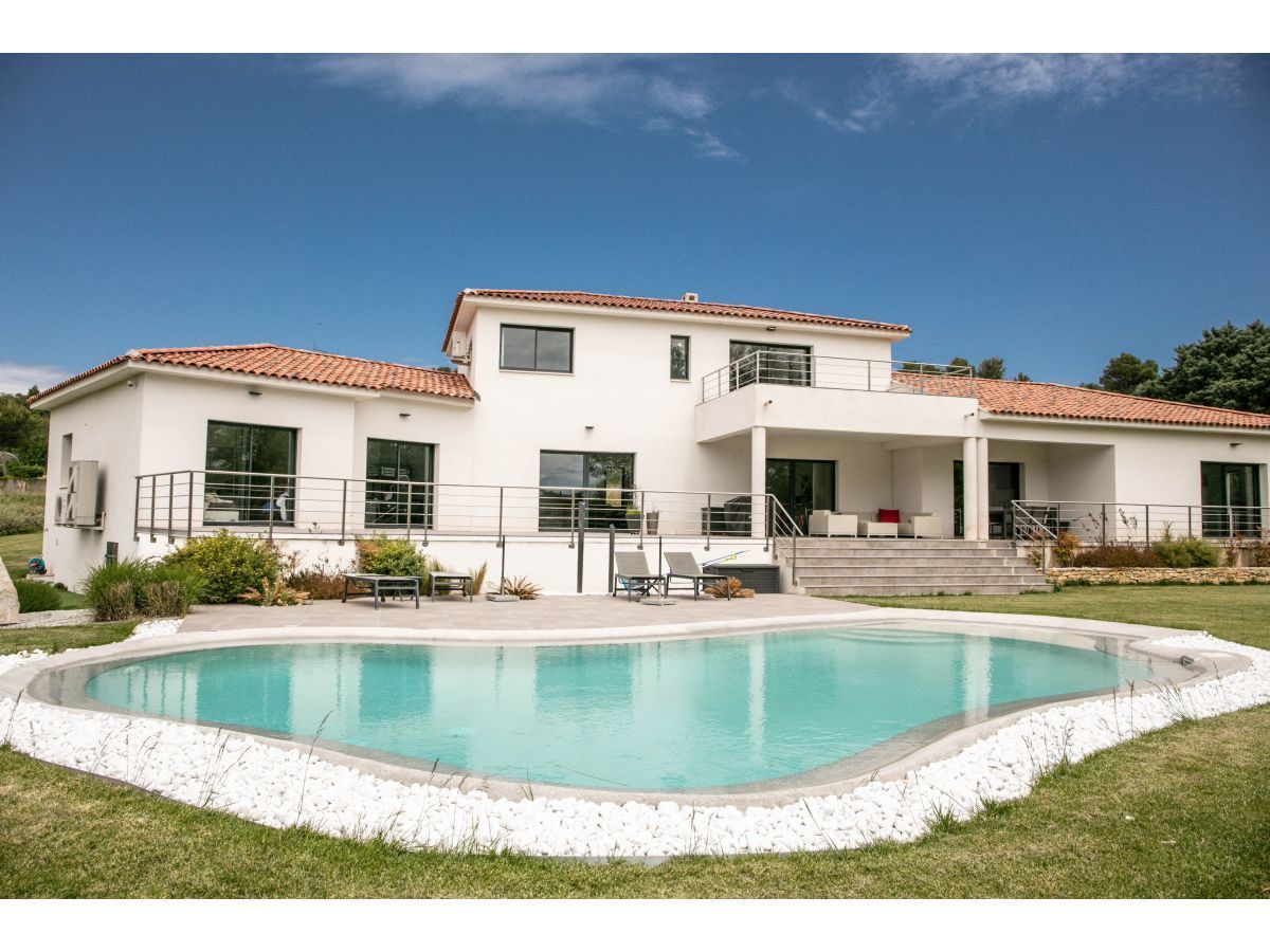 À vendre : maison contemporaine à l’architecture affirmée, avec de nombreux décrochements de façade qui lui confèrent un style moderne et élégant.