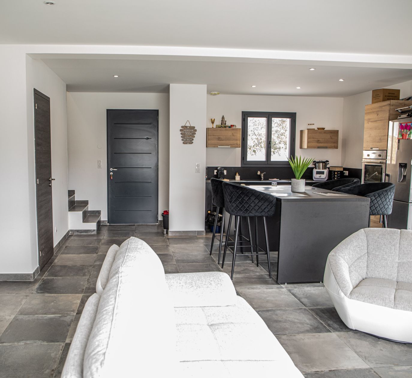 Cette maison à étage de 115 m² offre un espace de vie fonctionnel. Au rez-de-chaussée, une grande pièce de vie avec cuisine ouverte, un cellier attenant à la cuisine et un garage intégré viennent compléter l'espace jour.