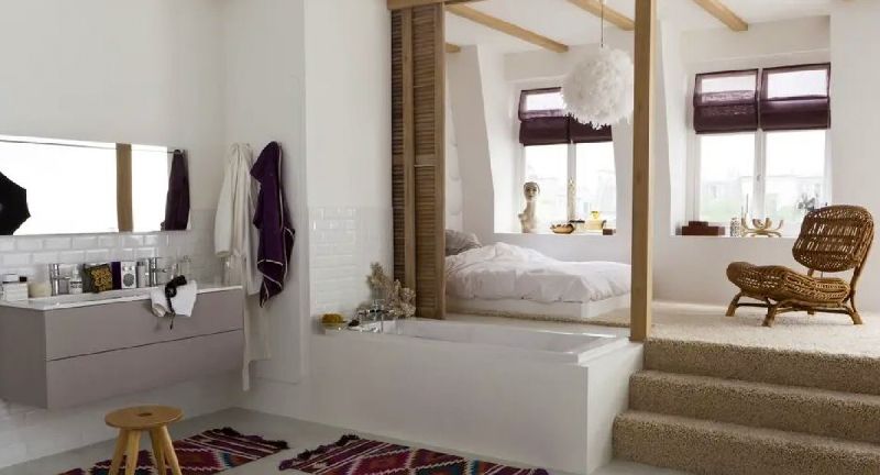 - Le tout en un avec le coin nuit, la salle d’eau et le dressing dans la même pièce. C’est extrêmement design, surtout avec une baignoire sur pied au milieu ! Par contre il peut y avoir des inconvénients à l’utilisation : gêne sonore, manque d’intimité…